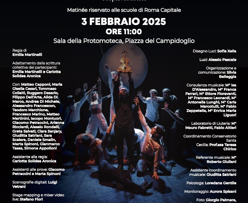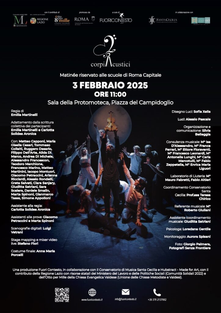 Lo spettacolo Corpi Acustici in scena alle ore 11 presso la Sala della Protomoteca del Campidoglio con un matinée dedicato alle scuole secondarie di primo e secondo grado di Roma Capitale.